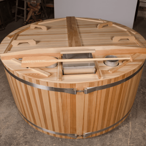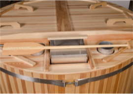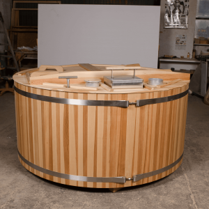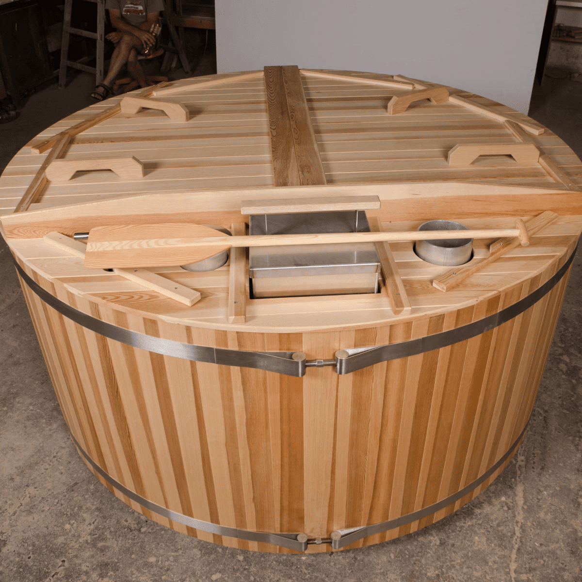 Samotný sud, víko a masivní schody – kvalitní, pečlivě opracované modřínové dřevo, průměr 200 cm, pohodlně pro 6 osob (při párty s přáteli až 8 osob). Součástí námi dodávaných sudů je také pádlo na míchání z kvalitního modřínového dřeva.